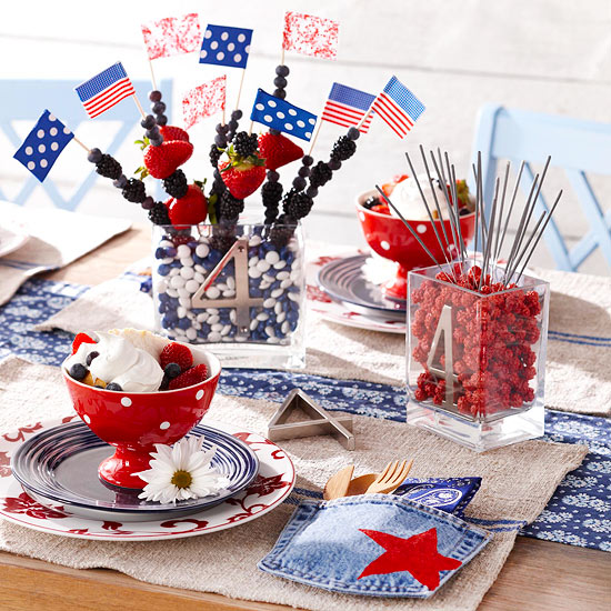 Show off pride for our country with this adorable and delectable centerpiece. In honor of the date, display a metal 4 house number inside a vase filled with holiday-color candies. Insert classic sparklers or berry skewers decorated with colorful ribbon flags. For fun Fourth of July place settings, use denim pockets to contain silverware. Cut denim pockets from worn-out jeans and set to the right of each place setting. To emphasize the patriotic scheme, stencil a bright red star on each pocket. Add a bandana napkin and utensils.