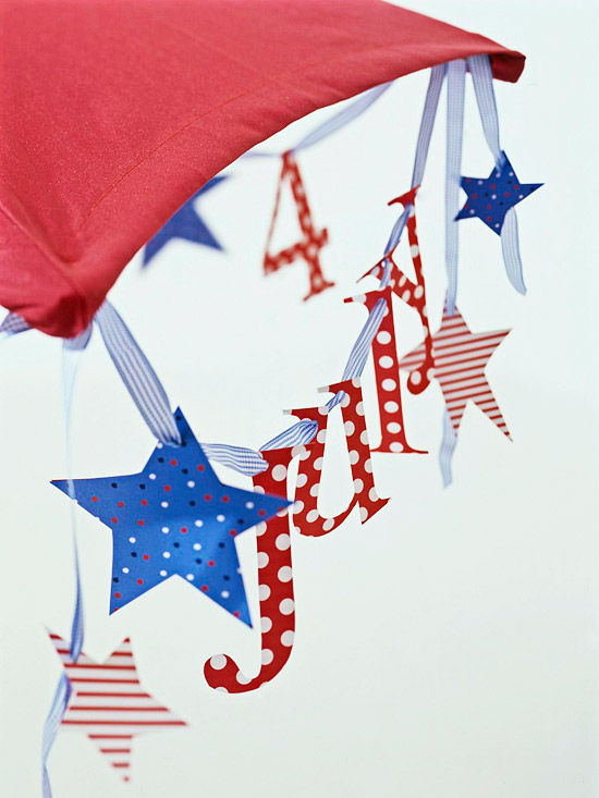 This festive banner can be hung anywhere. Type “July” on your computer and enlarge the font to desired size. Print and cut out the letters to use as patterns. Trace and cut out mirror pairs of letters from red, white, and blue patterned paper. Cut out pairs of stars in various sizes, too. Glue each pair with patterned sides facing out. Once dry, punch holes in the cutouts and string on a ribbon.