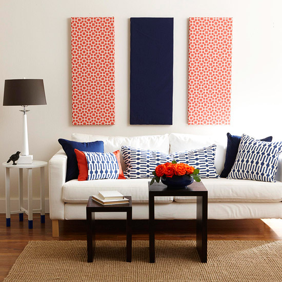 Create fun blocks of color to bring patriotic spirit to any room. Cover three plywood boards with red, white, and blue fabric. Using tacks or staples, secure the ends of the fabric in the back. Drill wall hooks into the back of each board for hanging. Tip: Change the fabric with the seasons and holidays.