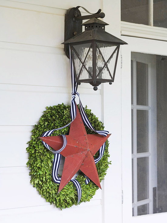 Make a bold patriotic statement by sprucing up your front door with a ribbon-wrapped star. Loosely tie a ribbon around a metal star and loop the ribbon around a hook or outdoor light fixture; secure with a knot. Make the star the center focus by hanging a wreath behind it.