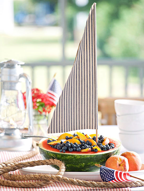 A simple sail is all you need to transform a watermelon fruit salad into a seaworthy centerpiece. Cut a triangle from ticking fabric and fold it in half over a dowel. Hot-glue the fabric along the dowel to secure and along the loose edges for a stiff sail.