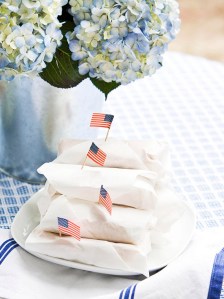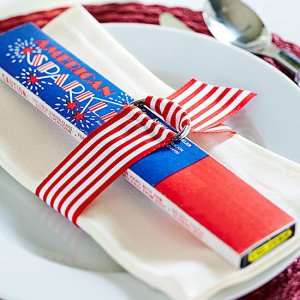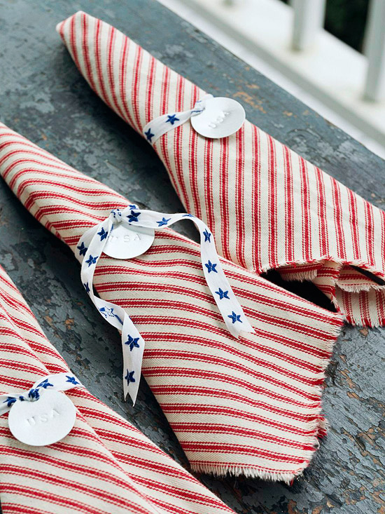 Salute Old Glory with star-studded napkin rings. Stamp “USA” into metal tags using a steel stamp set. Thread star-pattern ribbon through the tags and wrap around striped napkins. For no-sew napkins, cut cotton ticking in 16-inch squares; fray the edges by pulling on the threads. You also can roll silverware into the napkins for guests to grab as they head through the buffet line.