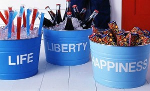 Display famous words from the Declaration of Independence on galvanized tubs. Coat tubs with white metal primer. Then paint each tub a different shade of blue. (Buy deep blue exterior paint and dilute with white exterior paint to get the two lighter hues). Use letter stickers to spell “life,” “liberty,” and “happiness” on the tubs. Fill with ice to hold drinks or frozen treats, or use without ice to hold sparklers for some 4th of July fun.