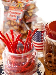 An arrangement of classic snacks is a great way to keep guests happy until the 4th of July picnic begins. We love the bright colors and nostalgic feel of licorice, pretzels, and boxed caramel popcorn.