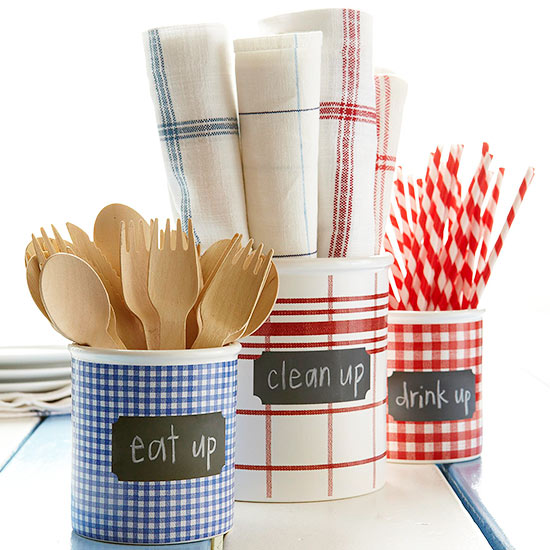 Don’t bother setting the table — guests can grab what they need from these adorable, no-fuss utensil jars. Simply decorate containters, like empty oatmeal canisters, by wrapping them with festive paper and securing with tape. Add an adhesive chalkboard label to send a fun message.