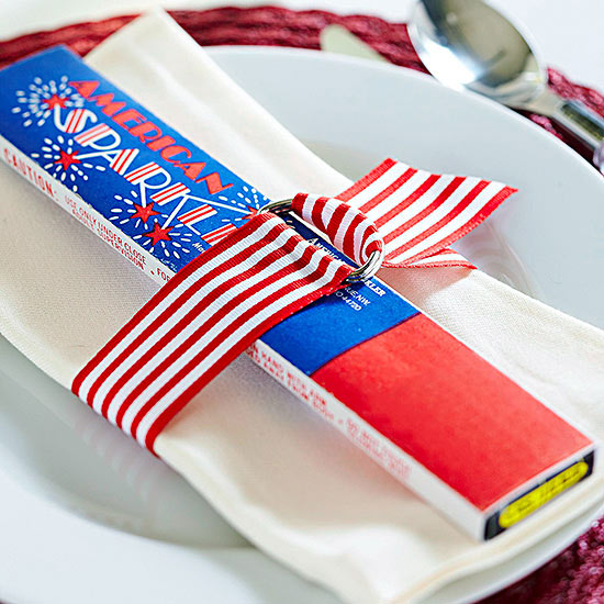 Encourage guests to get in the spirit by setting each place with a box of sparklers. For an easy, DIY napkin ring, glue the end of a 12-inch grosgrain ribbon to the flat side of a D-ring. Wrap the ribbon around a napkin and the sparklers, and loop it through the D-ring to secure.