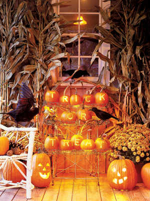 Decorated Tree ~ Bare-limbed trees provide the perfect ghostly perch for jack-o’-lanterns, candle lanterns, and a flock of faux black crows (don’t be surprised if a few real ones alight). Make sure the tree limbs are sturdy enough to support the weight of the items you are hanging and take care not to overdecorate, which can lessen the overall effect. Funkins (styrofoam pumpkins) are an especially good choice for this project, since they’re lightweight and won’t rot.