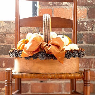 Fall Harvest Basket ~ Rimmed with pinecones and casuarina pods, this bentwood basket is ready to hold the fruits of your harvest. Golden pecan stain gives the inexpensive container a rich patina.