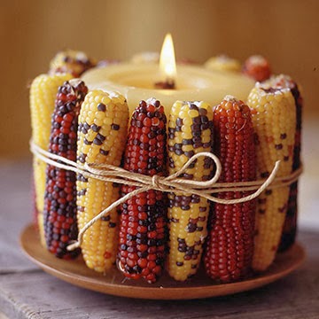 Corn and Candles Display ~ Elevate a basic pillar candle to Thanksgiving-worthy status. Hot-glue ears of Indian corn around a pillar candle and tie twine around the arrangement. For a more elegant look, substitute pretty satin ribbon for the twine.