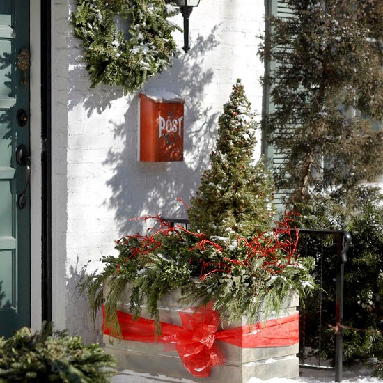 Whether you have a built-in planter or a simple weather-resistant version, consider placing it by your front door and filling it with a variety of seasonal accents. Here, a miniature tree, a colorful bow, and bright berries make a great combination. Other ideas include colorful garden orbs or even a sculptural branch wrapped in ribbon or lights.