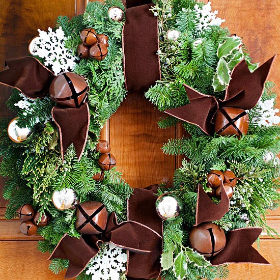 You can easily dress up holiday door wreaths with colors or special accents chosen to coordinate with the rest of your holiday decor. For example, wide bits of velvet ribbon, hot-glued at the back, to coordinate with the sleigh bells and snowflakes, attached here with wire.