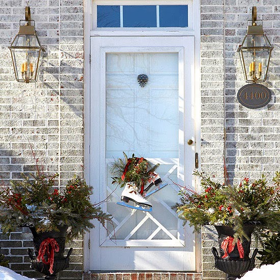 Wreaths are a lovely addition to nearly every front entryway. But there are other items that can work well to add seasonal interest to your door. Here, ice skates tied with a bit of greenery and ribbon dress up the traditional entry.