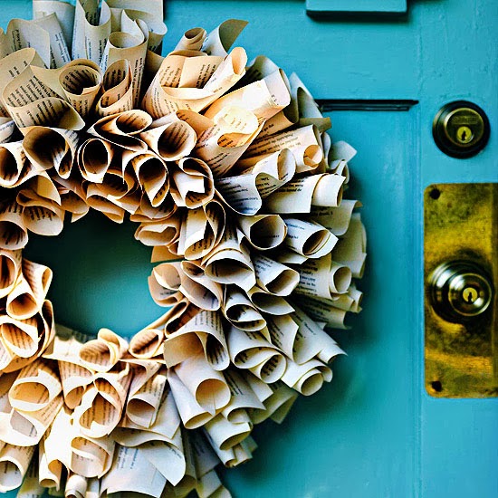 Evergreens and pinecones are standard elements for front door decorations, but there are other materials that can add texture and visual interest. Here, rolled-up cones of printed paper, torn from an old book, are glued to a wreath for a graphic update to a Christmas classic.