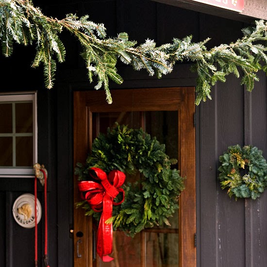 Sparkle and shine are synonymous with the season. Use this pretty silver front door decoration as inspiration to create your own glittering, seasonal welcome. Purchase a silver wreath or paint a grapevine wreath using metallic spray paint; add a sparkling ribbon and weave in silver and blue ornament balls. For another sparkling color scheme, use gold and bronze decorations to glam up your Christmas front door.