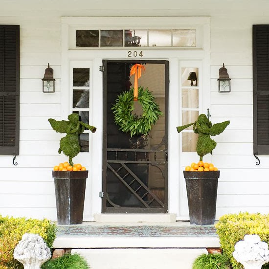 Take a new look at nontraditional items and colors to create unique Christmas door decorations. Here, orange is the unexpected holiday focus: Bright ribbon suspends the bay leaf wreath and piles of fresh oranges add a visual punch to the topiaries, which are sculpted as trumpeting angels.