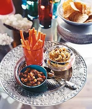 ~ Snacks: Let guests nibble on hearty little bites, as well as tidbits from gourmet markets, such as Bella Cucina Artichoke Lemon Pesto, Food Should Taste Good Olive Tortilla Chips, Sahale Soledad Almonds, and Tillen Farms Pickled Crispy Carrots.