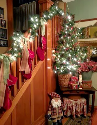 The Woodland ~ The Dining Room.Staircase: This tree displays all things nature pine cones, berries, pussy willows and twigs. It sits in a basket nestled on a table surrounded by coordinating Christmas items.