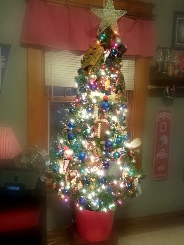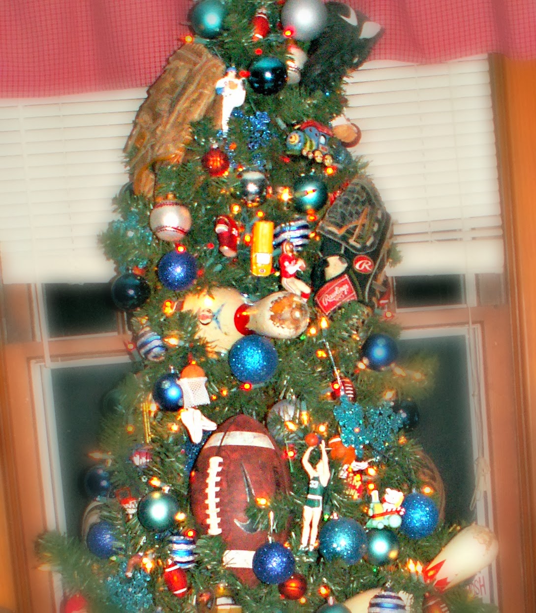Spencer’s Tree ~ Spencer’s Room: My middle son’s tree is a reflection of him (as all 3 of my kids trees are) SPORTS. It is adorned with sports ornaments, blue and silver balls, and tucked inside are real bowling pins, basketballs, baseball gloves, footballs, and of course cleats!