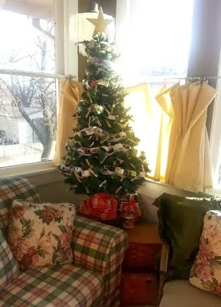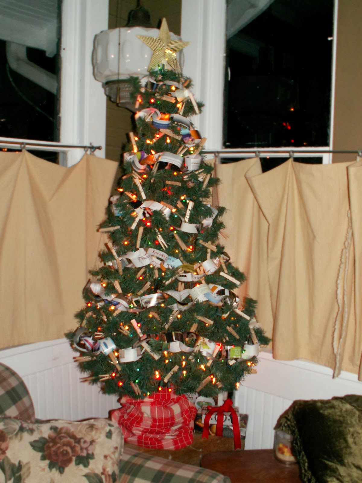 The Clothespin ~ The Laundry Room.Sun Room: As you can guess it is covered in clothespins. I couldn’t help but thinking though that it needed some color so I cut strips out of a magazine and made a garland chain. To finish it off we wrapped a few small packages in magazine pages and tied a red grosgrain ribbon around them. This was several tourists favorite tree which made me chuckle because it took the least amount of time, work and was really an after thought!