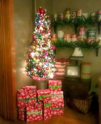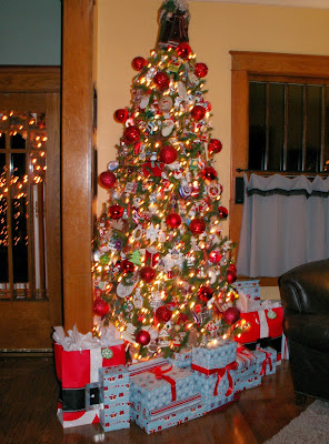 The Big One ~ The Living Room: This is our traditional tree that boasts over 1000 ornaments and it is a 10 foot splendor. Ornaments are an array of everything and yes, since everyone seems to be talking about my wrapping, the presents underneath all coordinate.