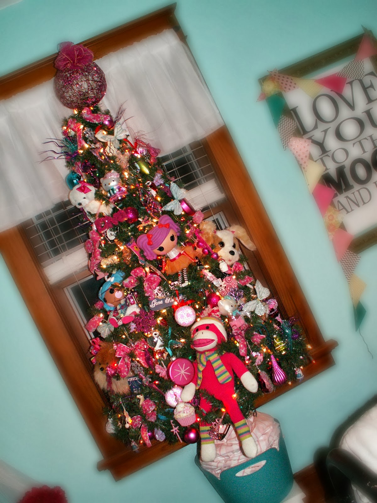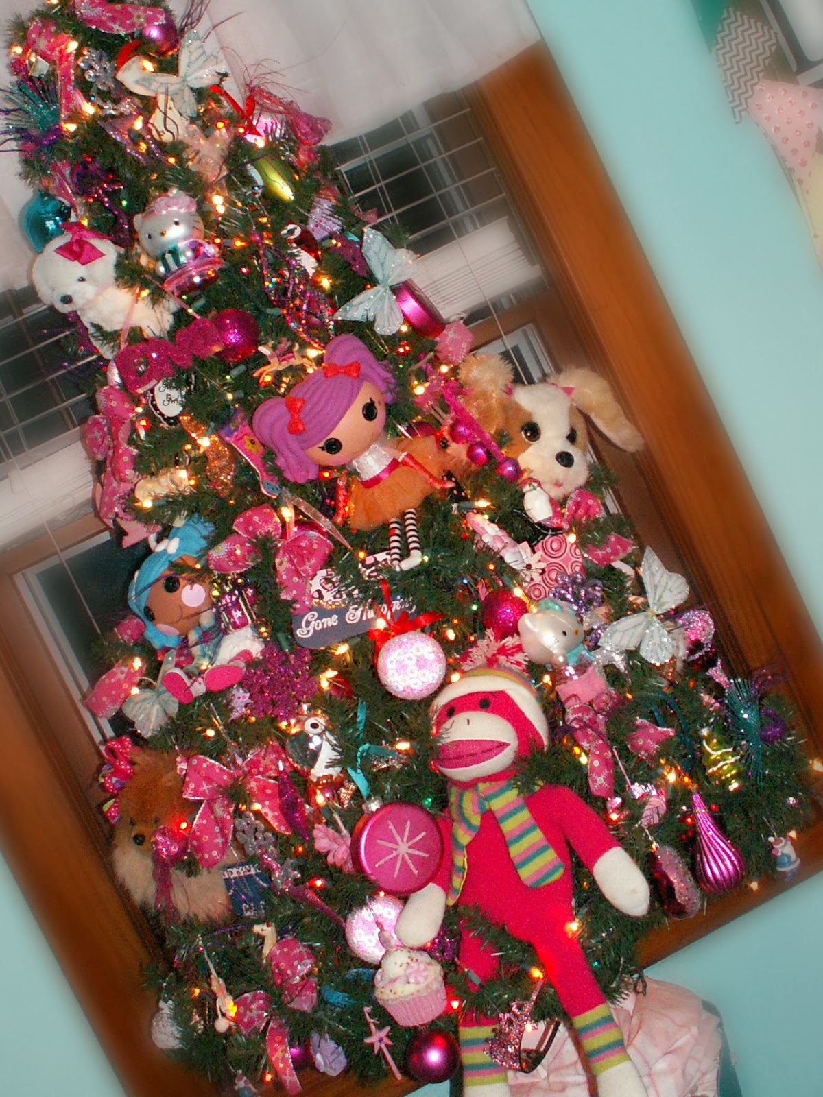 Eme’s Tree ~ Eme’s Room: This is another favorite of mine. This is my daughter’s tree with all things girly, we also added some of her “outgrown” toys like LaLaLoopsy dolls, Furr Real Dogs, Sock Monkeys and bracelets. It is truly HER tree!