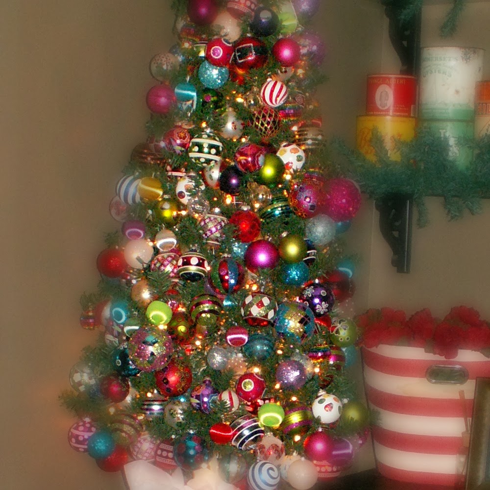 The Glass Ball ~ Hearth Room: My oh My, this is my favorite! It has over 800 glass balls throughout and I mean throughout. I start with putting them inside and work my way out ~ SHEW this trees is dangerous, literally because it’s mostly glass (and it is wired to the pipe to keep it from ever moving!!)