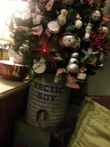 The Snow Man ~ The Kitchen: Well appropriately this snowman tree sits in an antique metal Artic Boy Cooler =)