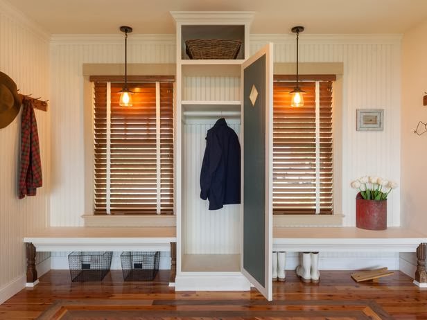 Incorporate Personal Style ~ Don’t be afraid to integrate your home’s style and personality into your mudroom design. Design blogger Kristin Salazar designs her mudroom as a direct reflection of her home’s shabby chic charm, while still using it as a functional entry storage spot. Hooks are a simple and inexpensive storage solution. Install enough for everyone’s coats, umbrellas, purses, backpacks, and briefcases.