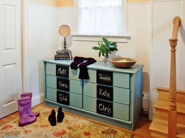 Create Storage With Repurposed Furniture ~ You can turn virtually any traditional entryway into a makeshift mudroom by utilizing your DIY skills. First, take an old dresser and dress it up with a fresh coat of paint. Then, use picture frames and chalkboard paint and add them to the center of each drawer front; these will serve as name plates, so each family member will have a designated place to properly store their winter gear and accessories.