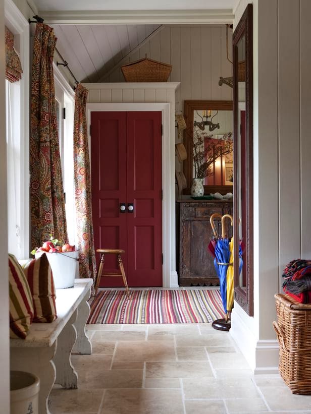 Tucked Away ~ Some homes simply require a small entryway with a quick place to tuck shoes and coats away without the use of a formal storage unit. Designer Sarah Richardson stores winter gear in a brick-red closet with an antique bench nearby and a full-length mirror right by the door for last-minute outfit checks.