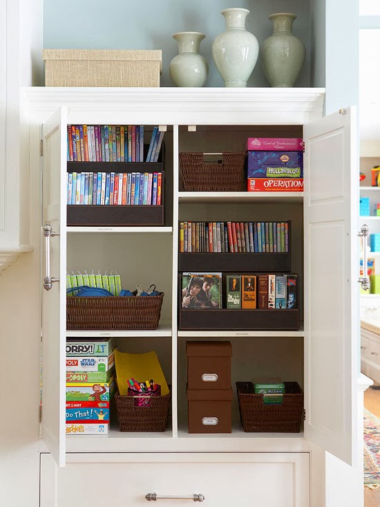 Room for Everyone ~ Since every family member spends time in this room, it can become a jumble of activities and items. Create storage for each activity, whether it’s reading, playing games, watching TV, paying bills, or playing with a pet.