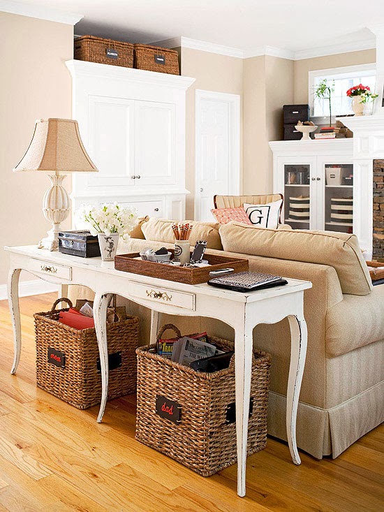 Task-It Baskets ~ Unlike a kitchen or mudroom, living rooms — designated for relaxing and conversing — often encompass more form than function. But even these livable spaces are required to have a little storage. Utilize large baskets or decorative bins to conceal blankets, toys, or media. If your front door opens directly into the living room, set up a console table with baskets tucked beneath for storing outerwear accessories, umbrellas, dog leashes, and more.