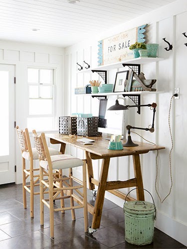 This office, found in the mudroom, brings in a secondhand pine table and barstools to keep with the homes theme. Remember when decorating your office, stick with thinks you love to look at, secondhand finds or not. When using or repurposing things you love, it may help you keep it tidy and organized.