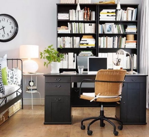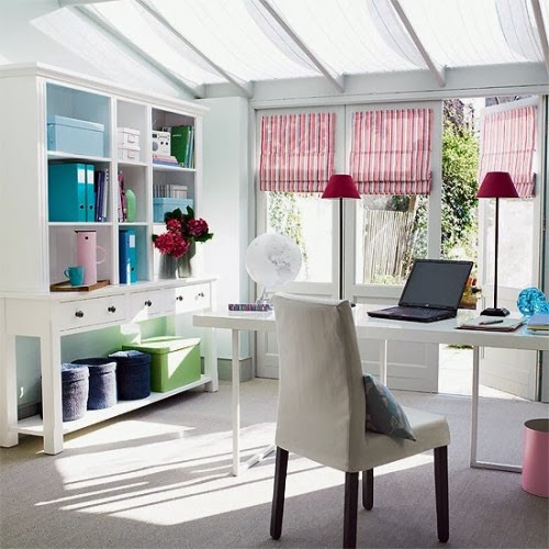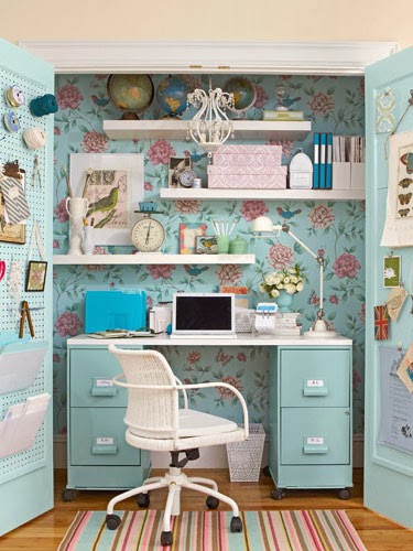 Think you don’t have enough space for a home office? Transform a cluttered closet into an accessible workspace that is blooming with inspiration. Choose a chair with an adjustable seat so that it can slide under the desk, which can be made using metal file cabinets and a ready-made melamine desktop.