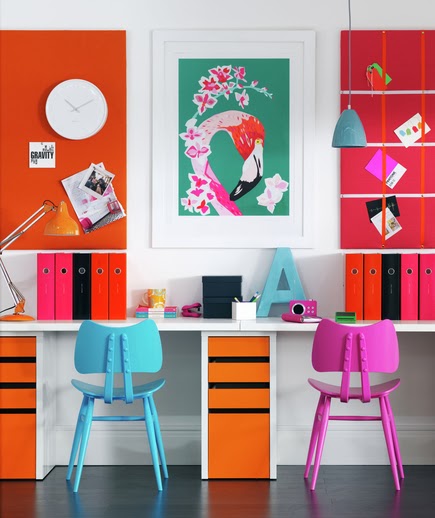 Color is a useful tool for differentiating a space. If you’re working side by side, stay consistent (one style of furniture) but invite in different colors to give the space some personality.