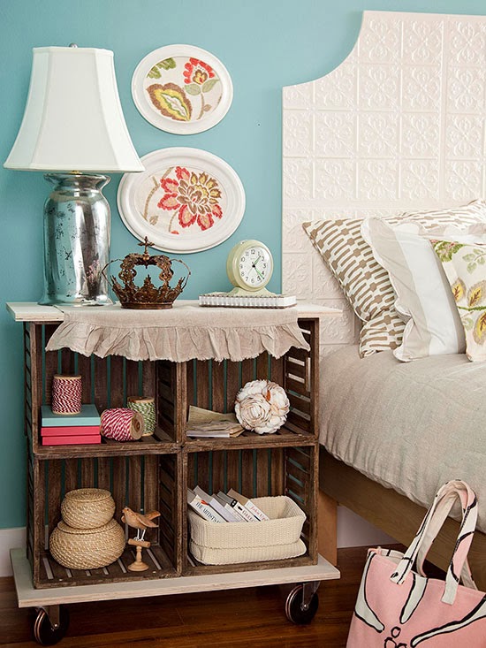 Crate Nightstand ~ Turn discarded crates into a full-fledged nighstand. Cut a piece of MDF to the desired size (it should be a little wider than the width of the two crates) and mount a set of casters to the bottom. Nail two crates into the top of the MDF. Place two more crates on top of the first pair and secure together with nails. Top the crates with another piece of MDF cut to size and secure it in place with nails.
