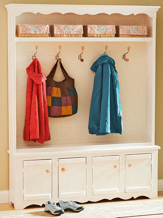Hang Your Hat (or Coat) ~ Give an old TV cabinet or china hutch a new purpose as an entryway organizer. To create this piece, we removed the doors and added hooks along the back of the hutch, gave the piece a fresh paint job, and added a shelf for extra storage.