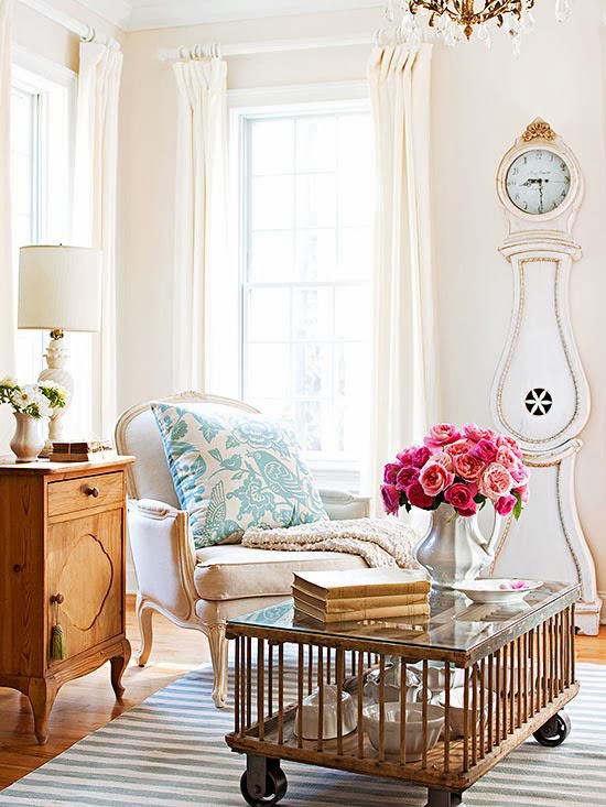 Cart It Away ~ An old chicken coop, four casters, and a sheet of glass come together as a fun coffee table for any living room with a flea market vibe. Screw the casters to the bottom and crown the cart with the glass top. Use the inside of the cage to display collectibles, such as pottery, fabric, or old books.