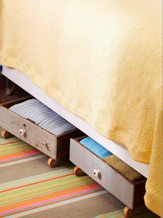 On a Roll ~ Scope out old dresser drawers to repurpose as another kind of bedroom storage. By attaching casters to the bottoms of the drawers, you’ll have a set of underbed storage units, making the space beneath the bed good for more than just dust bunnies.