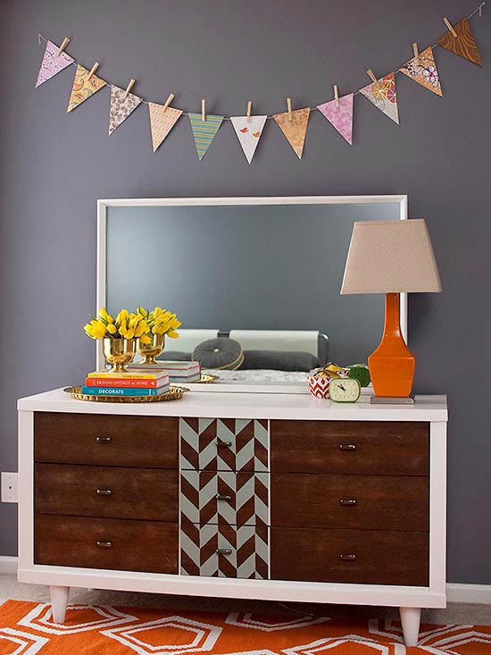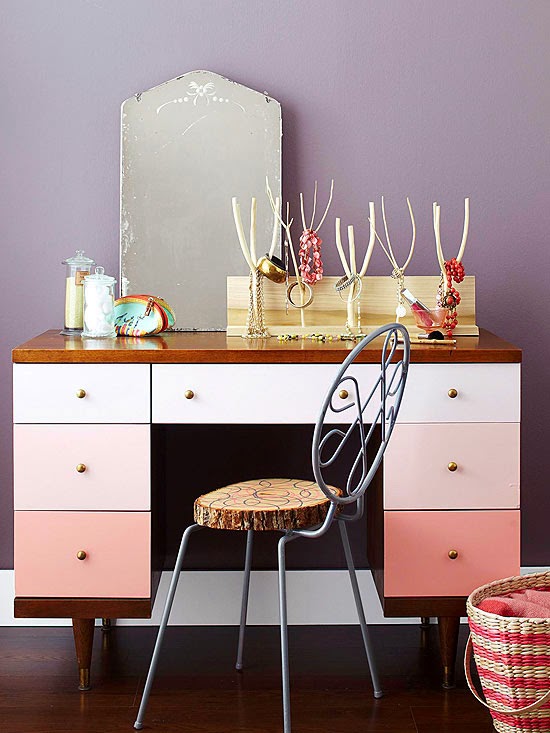 Give a desk or dresser an ombre effect. Pick a paint strip in a color you love and buy a can of paint for each drawer or “tier” of drawers. Use the lightest color on the strip for the top, the next darkest color (or colors, depending on how many drawers you have) for the middle section, and use the darkest color for the bottom drawer. Make sure to use colors in the order that they are displayed on the strip so you get a natural progression of color.