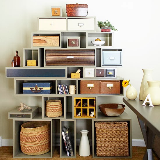Skip the basic bookcase and construct your own. Arrange a series of boxes in different sizes, stack, and attach.