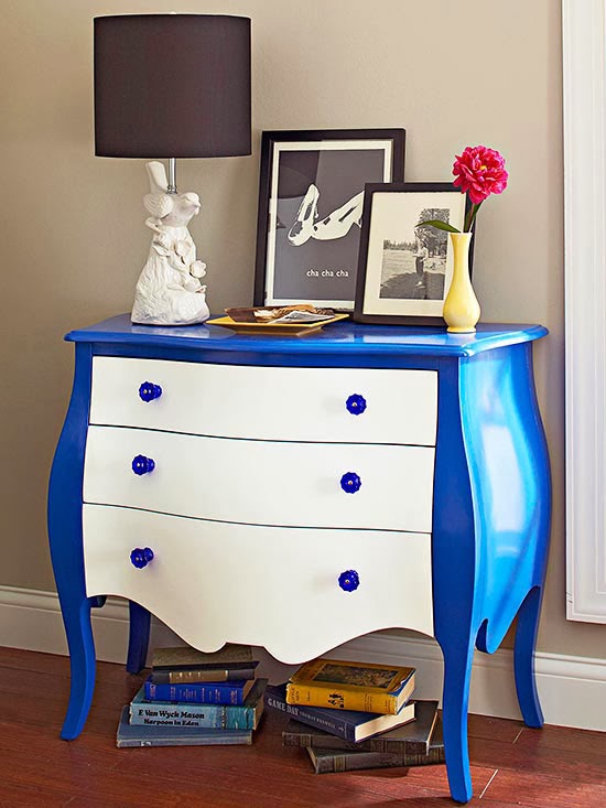 Why stick with just one paint color? The bowfront dresser’s glossy blue frame stands in contrast with the white drawer fronts. Try mixing paint finishes, too. Even though the difference is slight, the shift from semigloss to gloss can create an even more customized look.