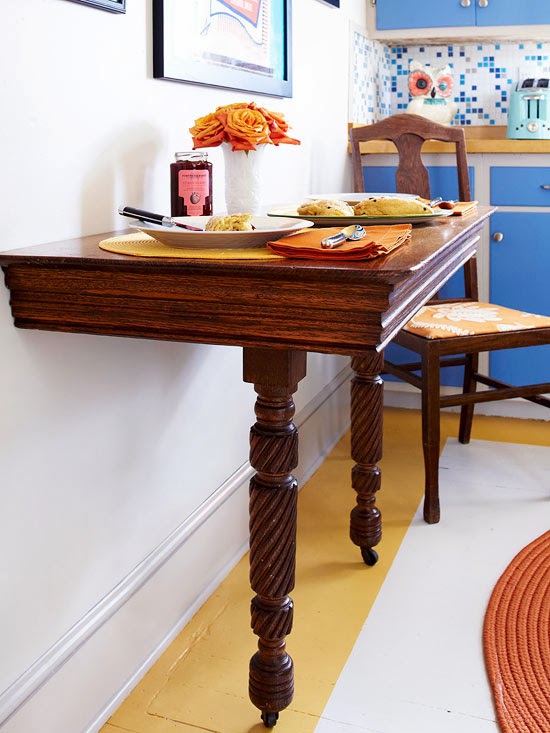 Even a dilapidated table can be revived with a bit of creativity and ingenuity. Shop for a table that is past its prime (this one was missing a leaf). You’ll also need a 2×2-inch board, wood screws, a table saw, and a drill. Take all of the hardware beneath the table off (sliding mechanisms, etc.) Cut the table in half lengthwise with the saw. Cut the board to 1 inch less than the width of the table. Attach the board with screws to wall studs at a height flush with the underside of the table. Fasten the table to the board from underneath with wood screws.