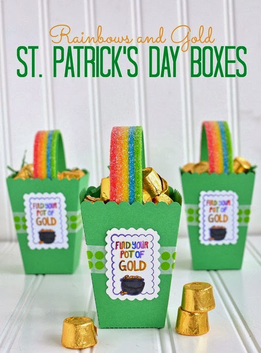 Taste the Rainbow ~ For these boxes use the popcorn box die cut. Fold and tape the box together, adding strips of green polkadot washi tape to the sides. Find a printable with the sentiment you like, print, shape and glue in place. For the handles, cut three 1″x11″ strips from the leftover green paper, tape it down on the inside near the bottom of the box. Use gold covered candies to fill the box ~ you may want to use some green Easter grass to fill the bottom of the box and then top off with candy. Use Rainbow “fruit” or Airheads Candy and just place and shape the strips right on top of the paper handles ~ obvioulsy you can’t adhere them you are planning on this portion being edible..