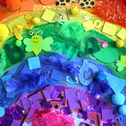 Giant Rainbow Collage ~ Collect rainbow-colored art scraps and make a big, easy-to-make collage for St. Patrick’s Day.