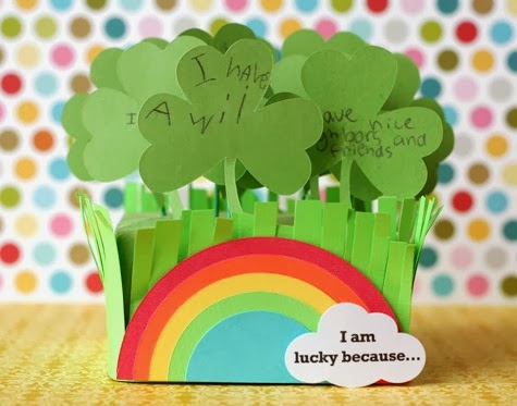 I am Lucky Because ~ Cover a block of styrofoam in green tissue paper. To make the fringe-cut two strips of green cardstock and adhere (spray glue is best) around the edges. Have family members write down reasons they are lucky on cardstock shamrocks and tape to green toothpicks and insert into the foam. Cut out circles in rainbow colors in descending sizes using, layer and adhered them altogether centered and cut in half.