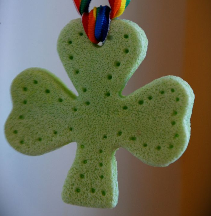 Lucky Charm ~ You will need 2 cups of Flour, 2 cups of Salt and 1 cup of Water. Mix the ingredients with a spoon until doughy and add a few drops of green food coloring . Use your hands to form into a ball then roll dough onto pan, while on the pan use a clover cookie cutter cut to shape (do this step directly on the pan so that you don’t have to move it after it has been cut). Using a straw, cut the hole to hang on the ribbon and if you wish to decorate further, use a toothpick to add stitched dots on the edge. Bake at 250 degrees, starting at 20 minute increments ~ the thickness of the clover will determine how long you cook them, typically for 40 minutes. Use Modge Podge after it has cooled to make it a bit shine and sprinkle with glitter you want some bling. Add a ribbon to hang once they have completely cooled.