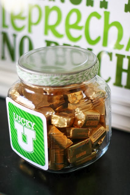 Simple St. Patrick’s Day Pot of Gold ~ Print your logo and attach to a clear container filled with gold wrapped candy!