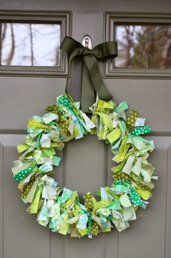 Simple St. Patrick’s Day Rag Wreath ~ Use a variety of scrap fabric in various shades of green. Tie around a wire hanger, formed into a circle or you could also use a wreath form.