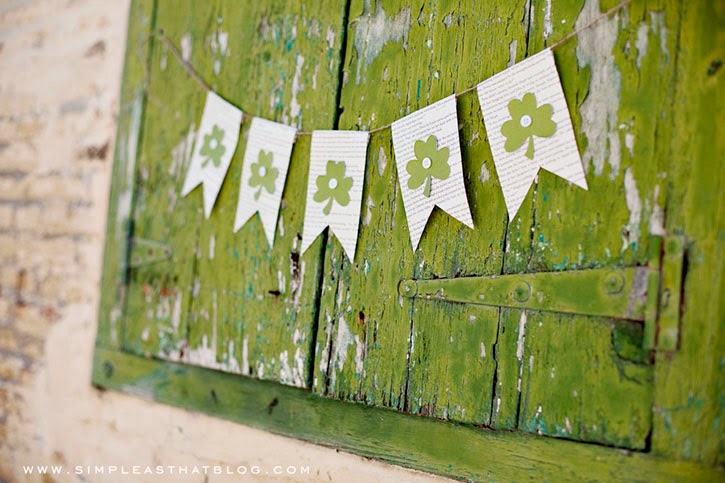 Simple St. Patrick’s Day Bunting ~ Use book pages cut out 5 or more rectangles approximately 3.5″ x 6″ in size. Cut a triangle shape out of the bottom of your rectangles. Cut out the number of shamrocks you’ll need from green cardstock. Attach shamrock’s to your banner pieces being sure to allow enough room to fold over the top edges. Place a button in the center of each shamrock. Simply cut a length of string and attach banner pieces to string by folding top edge of banner pieces over the string & staple. Space banner pieces evenly along the string by sliding them back and forth as needed.